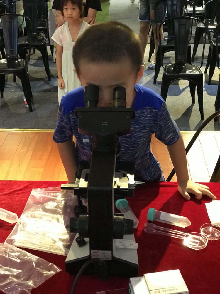 小朋友用显微镜观察深圳大鹏海域打捞的浮游生物