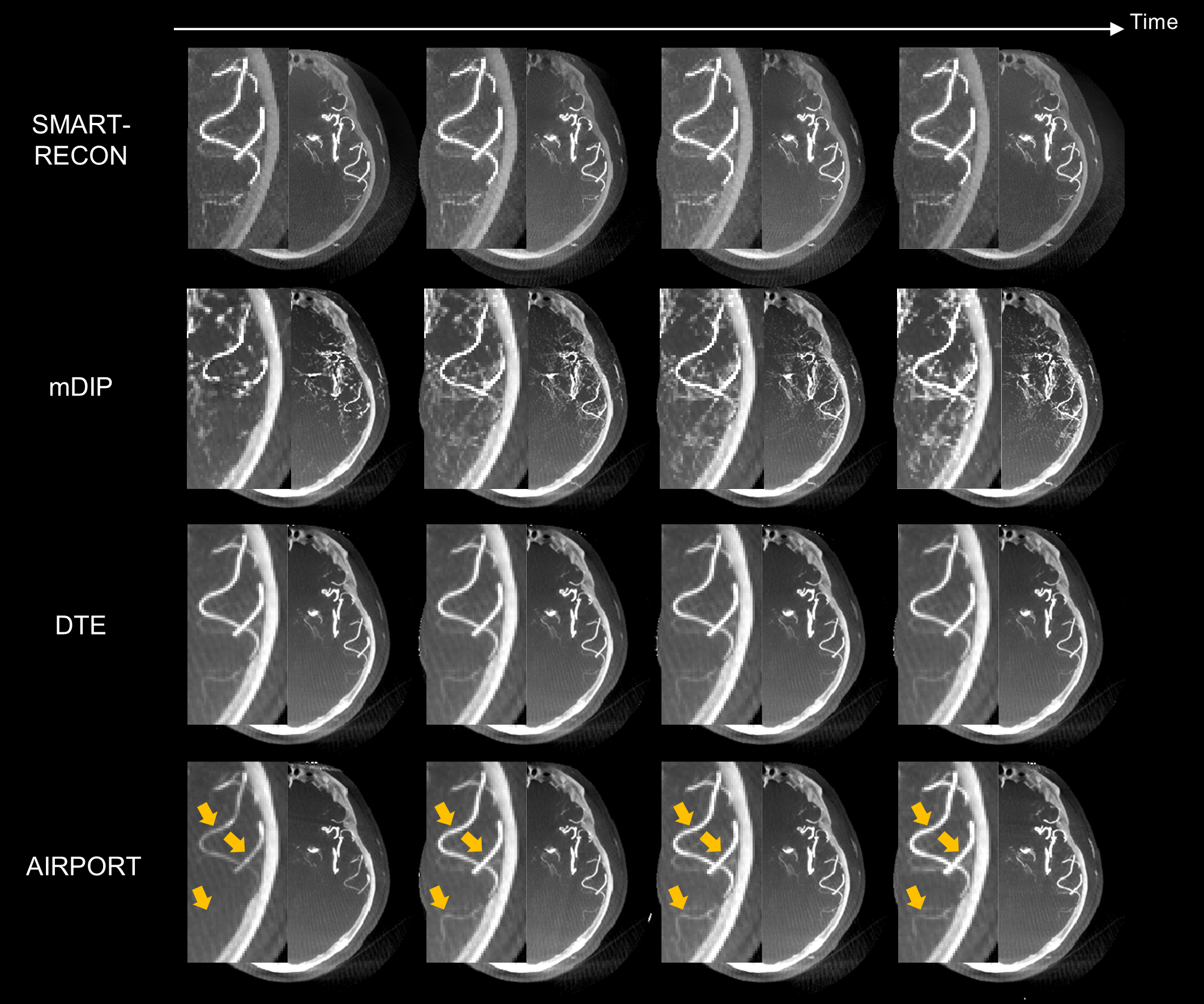 图3. 人体实验数据结果。如黄色箭头所示,提出的AIRPORT方法能够正确地重建由造影剂注射导致的动脉强度值的变化。