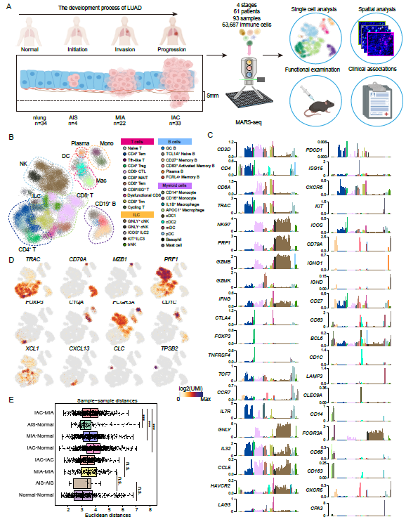 图2 人类肺腺癌发生发展过程免疫动态细胞图谱
