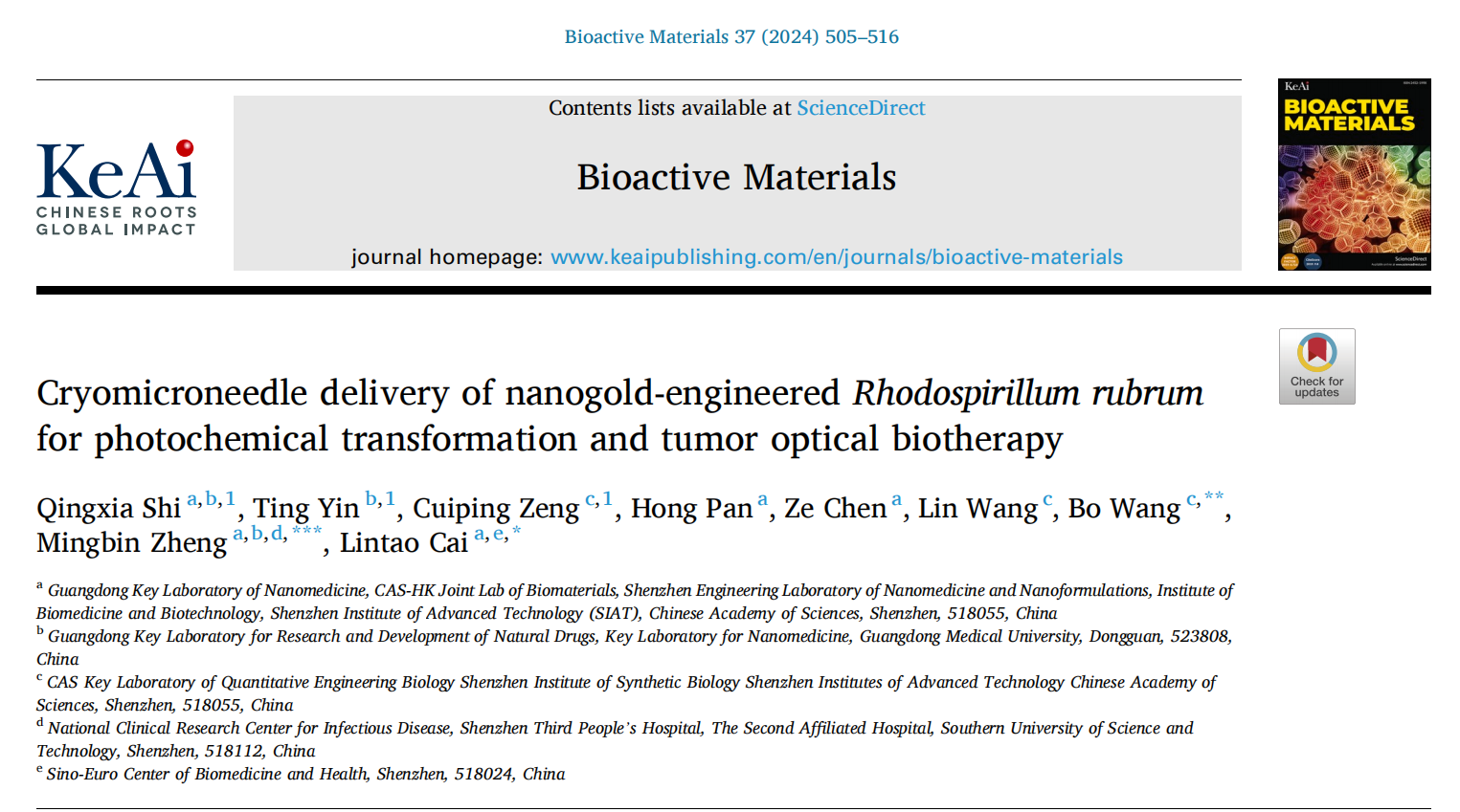 近日,中国科学院深圳先进技术研究院(以下简称“深圳先进院”)医药所蔡林涛团队与合成所王博团队合作,在利用天然细菌靶向肿瘤微环境乳酸消耗实现肿瘤光学生物疗法有效抑制肿瘤的生长取得新的进展,在KeAi Publishing旗下知名刊物Bioactive Materials(IF=18.9)上发表了题为“Cryomicroneedle Delivery of Nanogold-Engineered Rhodospirillum rubrum for Photochemical Transformation and Tumor Optical Biotherapy”的研究成果。该工作利用梯度冻存的方法制备了负载纳米金工程化深红红螺菌(R.r-Au)的冷冻微针治疗贴片(CryoMNs-R.r-Au),基于冷冻微针技术实现活性细菌药物在肿瘤部位的高效递送,成功克服了传统给药方法生物利用度低及安全性差等缺陷,在激光照射下,纳米金工程化深红红螺菌有效利用肿瘤微环境的乳酸作为电子供体实现乳酸消耗同时产生氢气,二者实现协同抗肿瘤治疗有效抑制肿瘤的生长,提出了一种基于活性细菌药物利用肿瘤代谢物作为有效物质,并通过自身代谢产生有效治疗性气体实现光学生物治疗的全新抗肿瘤策略。
