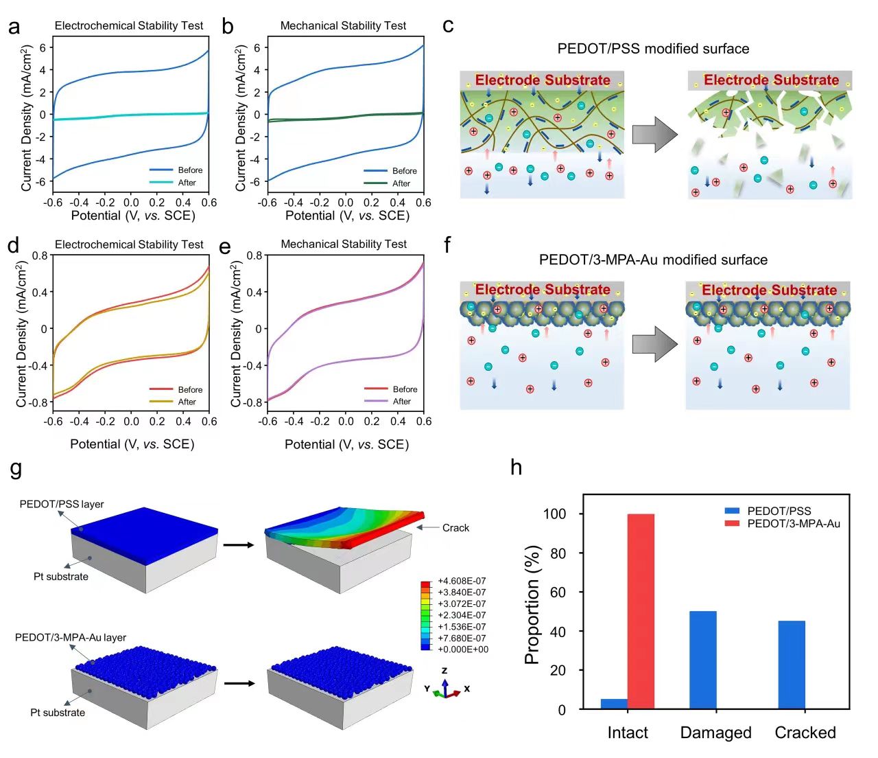 研究团队证实,所提出的方法能够有效强化导电聚合物修饰层与刚性电极间的结合,展现出卓越的电化学和机械稳定性。在经历多达100次的循环伏安测试以及机械超声(功率为120W)的严格测试后,PEDOT/3-MPA-Au电极仍维持着较低的电化学电阻(如图2所示)。此外,团队还借助有限元分析,对PEDOT/3-MPA-Au以及传统导电聚合物膜(PEDOT/PSS)在电化学作用及溶液环境下的扩展过程进行了研究,并揭示了裂纹的萌生与扩展过程。从理论层面,研究团队深入阐释了修饰层与基体界面间的增韧机制,即PEDOT/3-MPA-Au在衬底界面处经历的膨胀与应变最小,从而揭示了其在提升界面长期稳定性方面的关键作用。