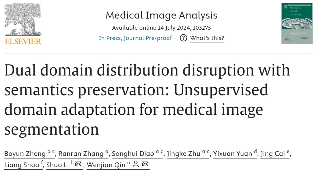 近日,中国科学院深圳先进技术研究院科学仪器所(集群)(筹)秦文健研究员课题组在医学影像期刊Medical Image Analysis上发表了题为“Dual domain distribution disruption with semantics preservation: Unsupervised domain adaptation for medical image segmentation”的文章。