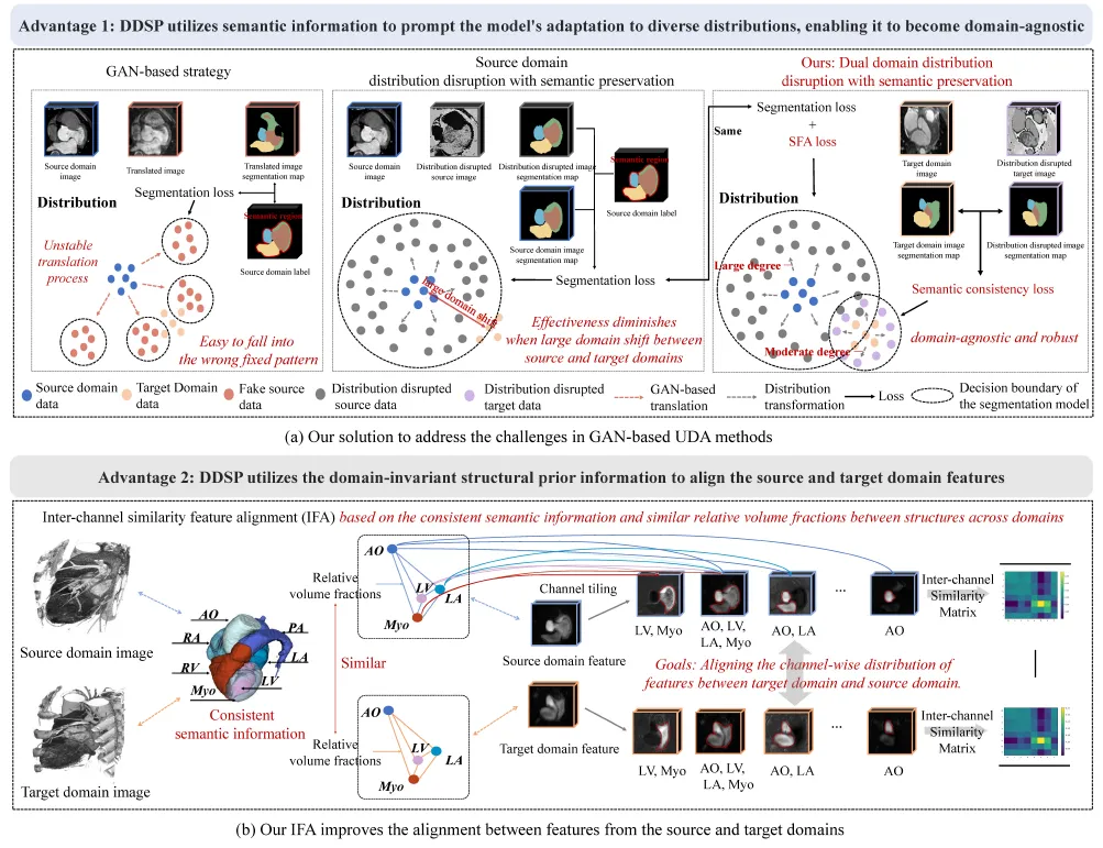 为了解决这些问题,本研究提出了一种全新的双域分布多变-语义约束的三维方法(DDSP),通过结合双域分布干扰与语义保持策略,显著提升了模型在不同成像条件下的泛化能力,且无需目标域的标注数据。除此之外,本研究还引入了基于域不变结构先验信息的特征对齐模块,促进双域共享参数的分割器在目标域特征上的性能。