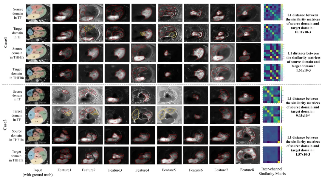 实验结果表明,DDSP在多个评价指标上均超越了现有的最先进方法,并且与全监督模型相比也展现出了较小的性能差距。尤其是在MMWHS17数据集上,DDSP在双向跨模态心脏子结构分割任务上平均Dice分别达到了0.890和0.819。同时,为了验证所提出特征对齐模块的有效性,研究人员还展示了加入模块前后,模型所提取的源域特征和目标域特征在内容凸显上的对齐程度。