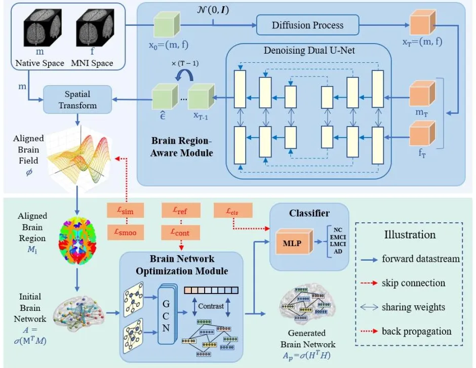 具体而言,研究团队首先通过设计的大脑区域感知模块(BRAM)的扩散学习过程,实现个性化脑区的精准定位,避免了主观参数选择,并自动化对齐标准脑模板空间。然后利用图对比学习思想,通过稀疏化冗余连接,实现个体化大脑连接优化,从而增强同一组内大脑网络的一致性。最终通过设计节点-图对比损失和分类损失的联合约束机制,实现重建脑网络优化。