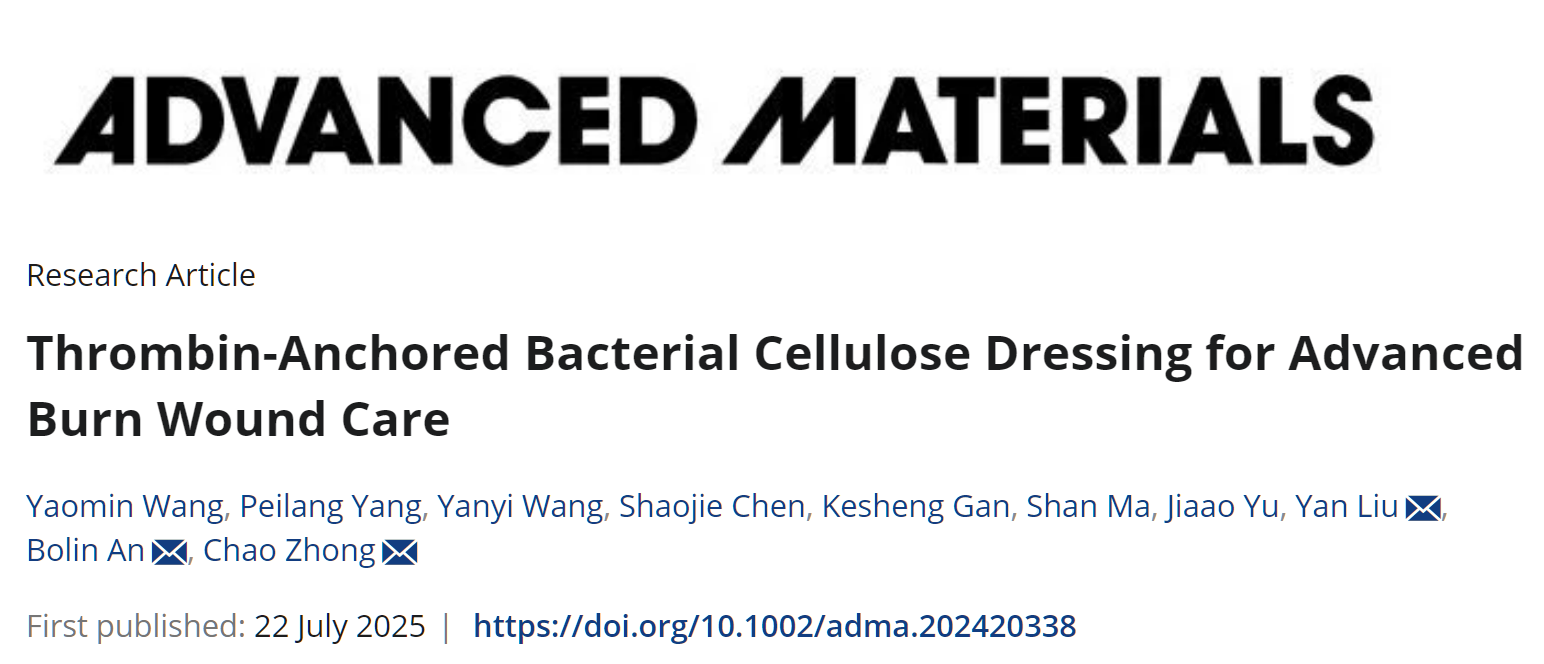近日,中国科学院深圳先进技术研究院定量合成生物学全国重点实验室、合成生物学研究所材料合成生物学研究中心钟超团队,联合上海交通大学医学院附属瑞金医院烧伤整形科刘琰团队,在国际学术期刊Advanced Materials发表题为“Thrombin-Anchored Bacterial Cellulose Dressing for Advanced Burn Wound Care”的研究论文。该研究基于纤维素结合结构域(CBD)的非共价桥连机制,成功将重组人源凝血酶固定于生物纤维素基体上,构建出兼具止血与促愈合功能的一体化敷料(T-BC)。该材料在烧伤创面护理中表现出优异的生物性能和组织修复能力,为严重创伤管理提供了新的材料策略,并展现出良好的临床转化潜力。