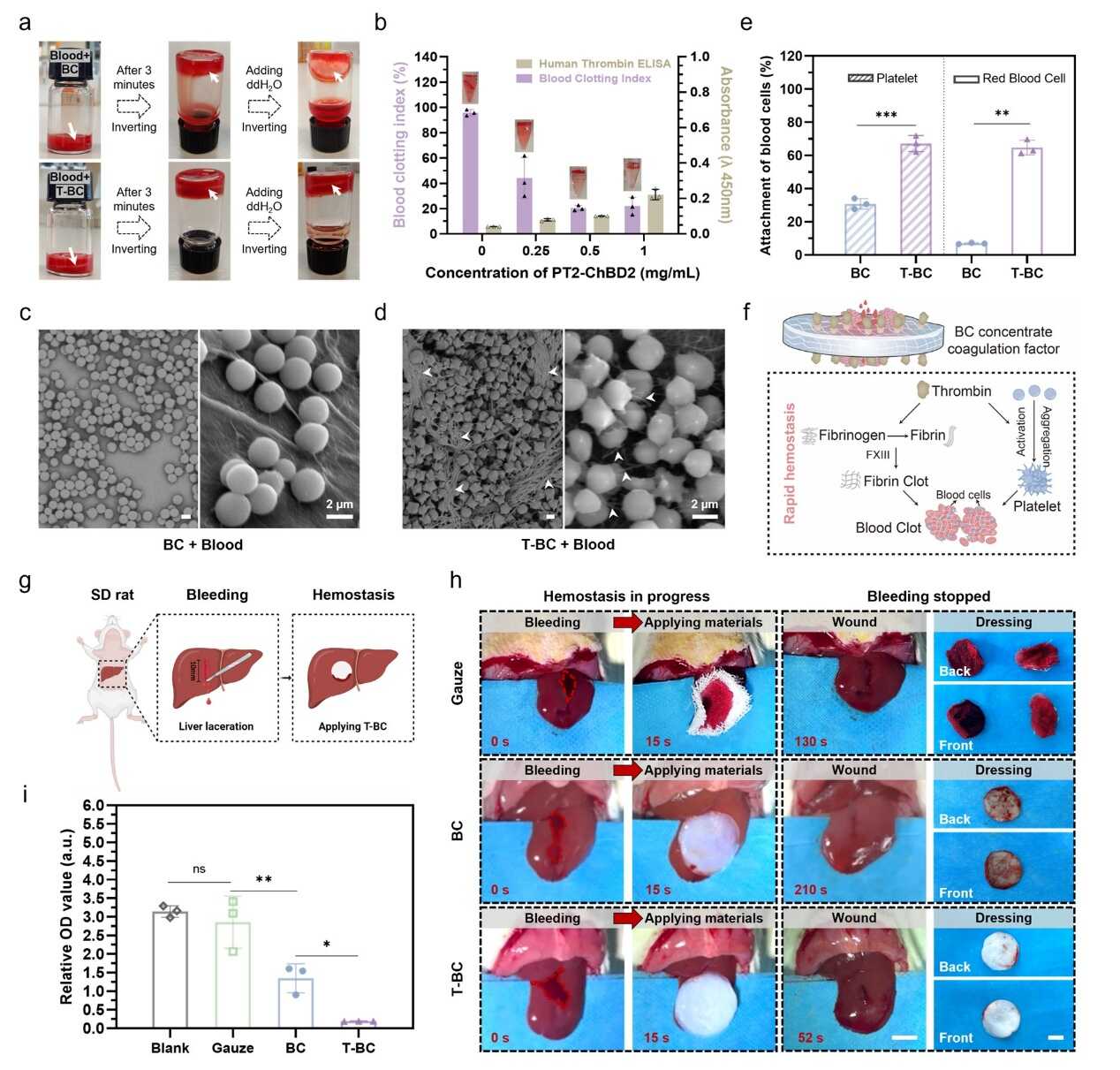 在初步实验中,研究团队首先筛选获得了能够与生物纤维素高效、稳定结合的纤维素结合结构域(CBD),并将其与人凝血酶原-2构建为融合蛋白进行表达。该融合蛋白经蛇毒酶Ecarin激活后成功转化为具有完整酶活性的CBD-凝血酶,并在体外实验中表现出显著的促凝血功能,能够快速诱导血液凝固。进一步通过大鼠肝脏切口模型验证了该策略的止血效果:CBD-凝血酶与BC基质的稳定结合将BC转化为具有生物活性的功能性止血敷料,可在1分钟内实现快速止血(图2),表现出优越的即时止血能力。此外,研究系统开展了T-BC敷料的细胞毒性、溶血活性与组织相容性评价,相关结果表明该材料具有良好的生物安全性,支持其在临床烧伤创面修复中的应用。
