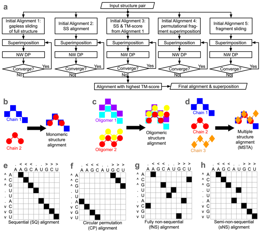 图1. US-align的算法流程图(a)与可执行的三维结构比对任务,包括b, 单体结构两两比对;c, 复合物结构两两比对;d, 多结构比对;e, 序列顺序比对;f, 循环顺序比对;g, 完全非序列顺序比对;h, 部分非序列顺序比对。