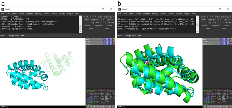 图2. 通过PyMOL插件执行US-align结构比对任务。a, 比对前。b, 比对后。