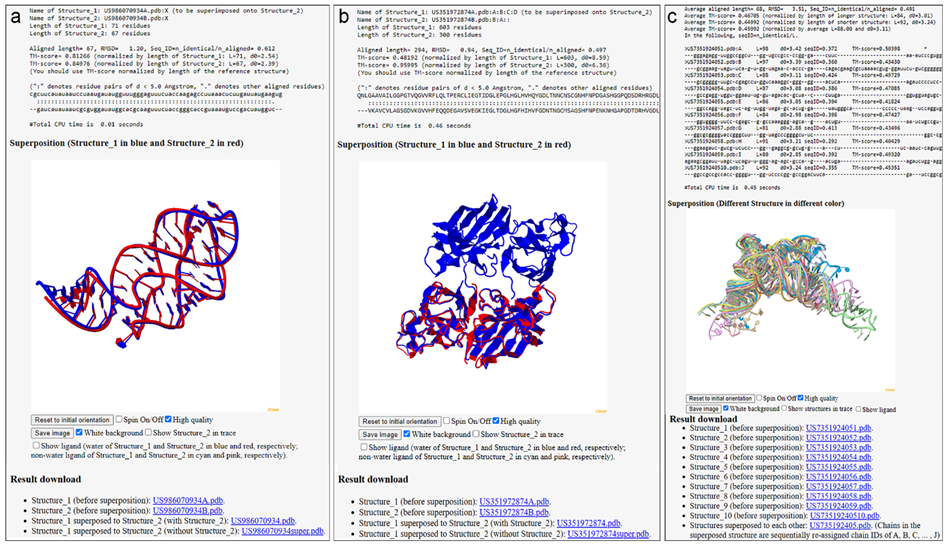 图3. 通过网页服务器执行US-align比对任务的网页输出。a, 单体RNA结构的两两比对。b, 蛋白复合物的两两比对。c, RNA的多结构比对。