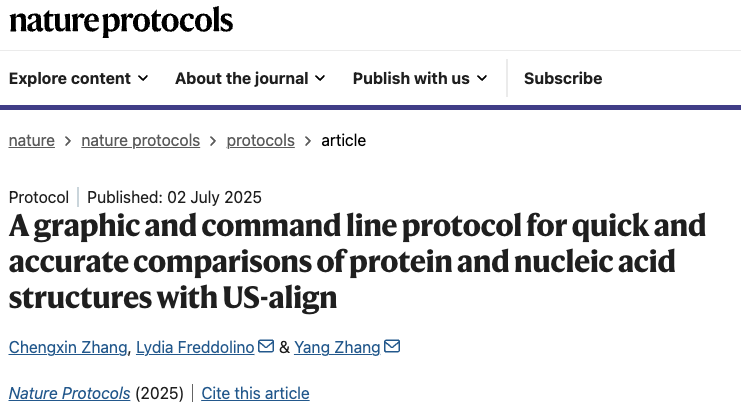 近日,中国科学院深圳先进技术研究院张成辛研究员、密歇根大学Lydia Freddolino教授、新加坡国立大学张阳教授团队在Nature Protocols上发表研究论文“A graphic and command line protocol for quick and accurate comparisons of protein and nucleic acid structures with US-align”,系统介绍了他们开发的通用结构比对工具US-align(https://zhanggroup.org/US-align/)。该算法支持蛋白质、DNA、RNA及其复合物的快速统一比对,具备命令行、PyMOL插件和网页服务器三种使用方式。