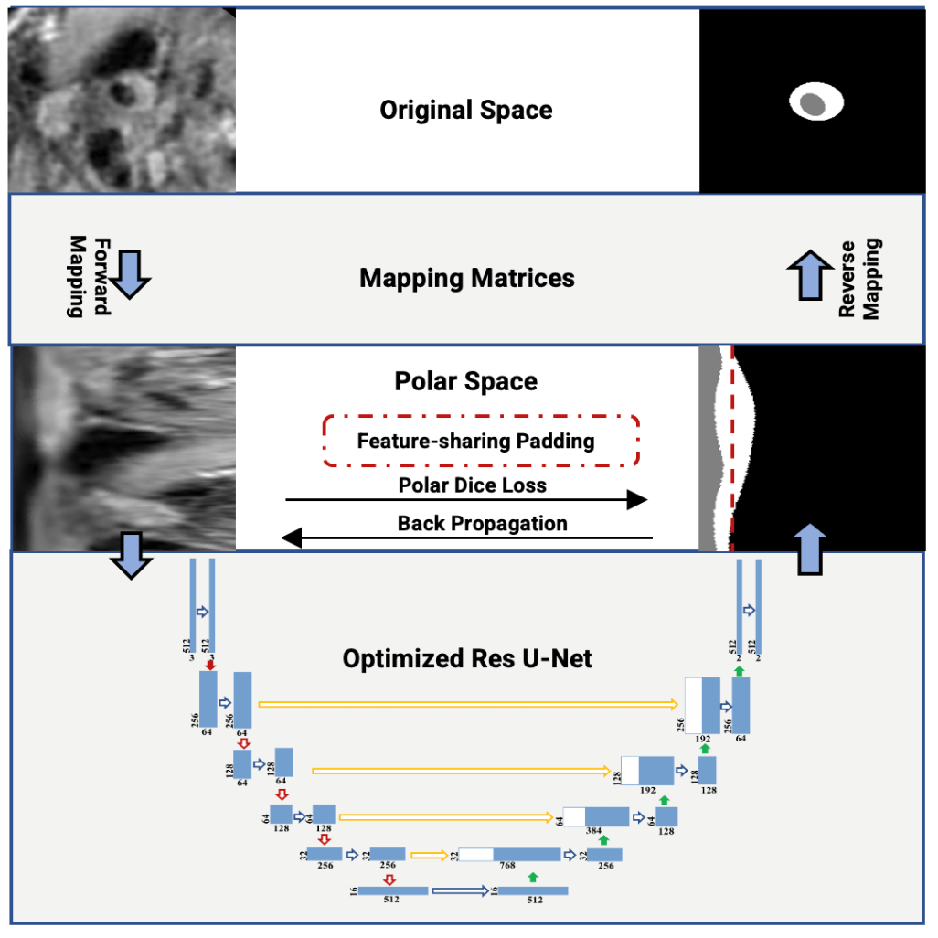 具体而言,团队借鉴数学中的极坐标概念,将圆形的血管横截面如同展开一幅卷轴般转换为平面矩形结构,这种“线性化”处理显著增强了模型对血管壁径向厚度变化与连续性的表征能力,从而在解剖结构复杂的区域实现了分割精度的大幅提升。此外,为解决极坐标变换可能带来的角度端点不连续问题,研究者设计了特征共享填充策略,确保了血管壁在角度维度上的形态连贯性,进一步提升了模型对真实解剖结构的建模精度。最后,团队还提出了专门的极坐标Dice损失函数,重点优化在图像中占比小、却极具临床意义的血管壁区域,使模型在复杂背景中仍能保持优异的边界识别能力。