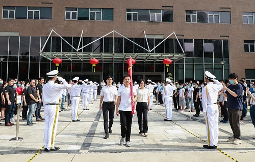 升旗仪式正式开始,全体人员面向国旗肃立,行注目礼,鲜艳的五星国旗在国歌声中冉冉升起。为纪念国家第7个烈士纪念日,升旗仪式结束后,全体人员默哀,缅怀为国捐躯的抗战英雄、因公殉职的抗疫英雄。