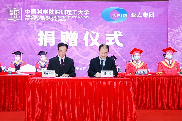 6月24日,中国科学院深圳理工大学(筹,简称中科院深理工)捐赠仪式在中国科学院深圳先进技术研究院举行。深圳亚太控股集团有限公司向中科院深理工捐赠人民币500万元,用以支持中科院深理工人才培养、科学研究、师资建设等。