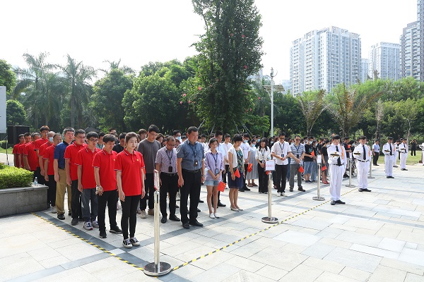 升国旗结束后,全体人员默哀,缅怀为国捐躯的抗战英雄、因公殉职的抗疫英雄。