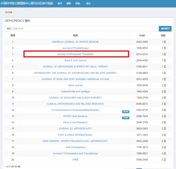 Journal of Orthopaedic Translation入选中国科学院分区表1区