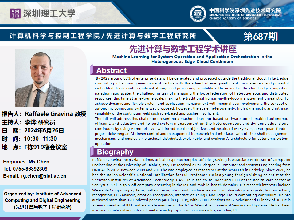 大家好!数字所/计算机学院第687期学术讲座将于6月26日10:30-11:30在F919会议室举行,本次讲座将邀请 意大利 卡拉布里亚大学 Raffaele Gravina 教授作题为“Machine Learning for System Operation and Application Orchestration in the Heterogeneous Edge-Cloud Continuum”的报告。本次报告将由数字所 李烨 研究员主持,诚挚邀请大家参加、学习和交流!