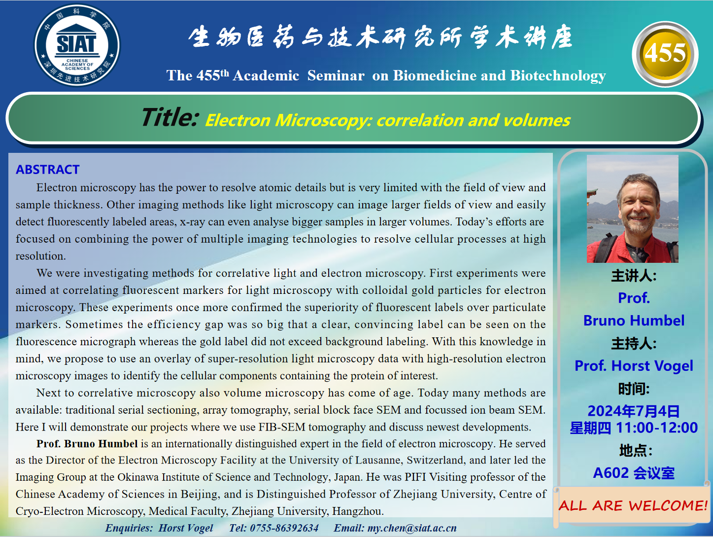 大家好! 医药所第455期学术讲座将于2024年7月4日 星期四 11:00-12:00 A602会议室举行。本次讲座邀请了来自日本冲绳科学技术大学 Prof. Bruno Humbel 带来“lectron Microscopy: correlation and volumes”的报告。届时,Prof. Horst Vogel将主持讲座。