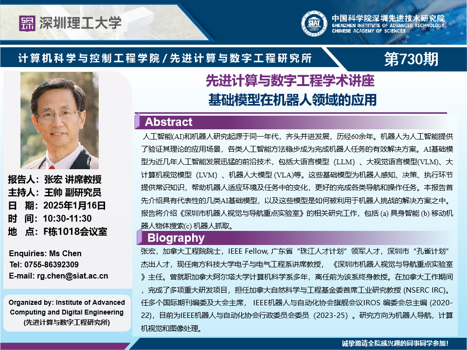 数字所/计算机学院第730期学术讲座将于1月16日10:30-12:00在F1018会议室举行,本次讲座将邀请南方科技大学 张宏 讲席教授作题为“基础模型在机器人领域的应用”的报告。本次报告将由数字所 王帅 副研究员主持,诚挚邀请大家参加、学习和交流!