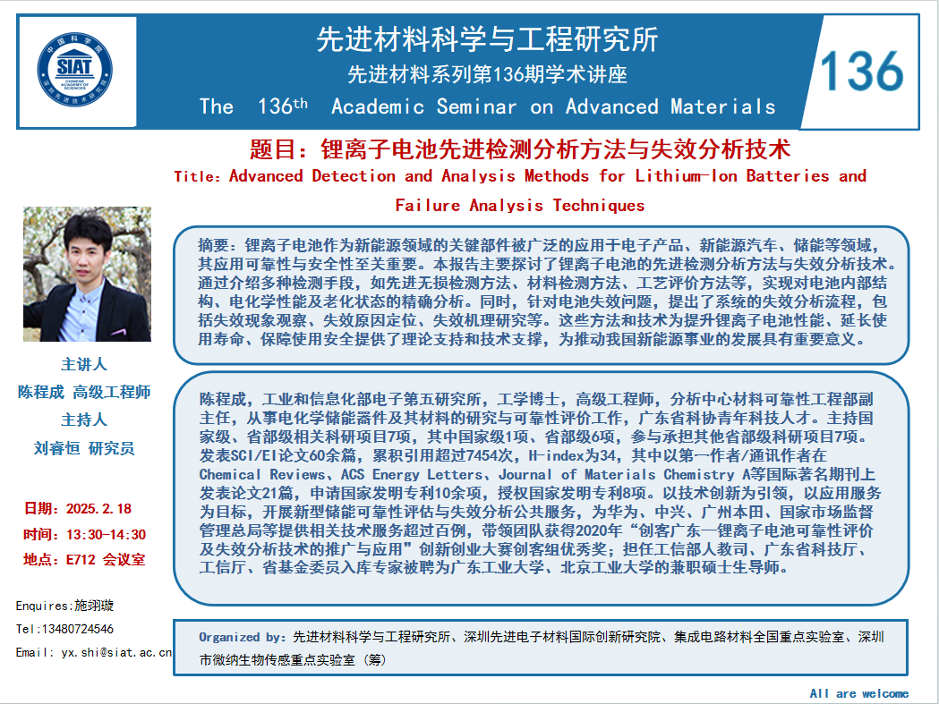 本次讲座邀请了 工业和信息化部电子第五研究所 陈程成 高级工程师 带来题为“锂离子电池先进检测分析方法与失效分析技术”的报告。