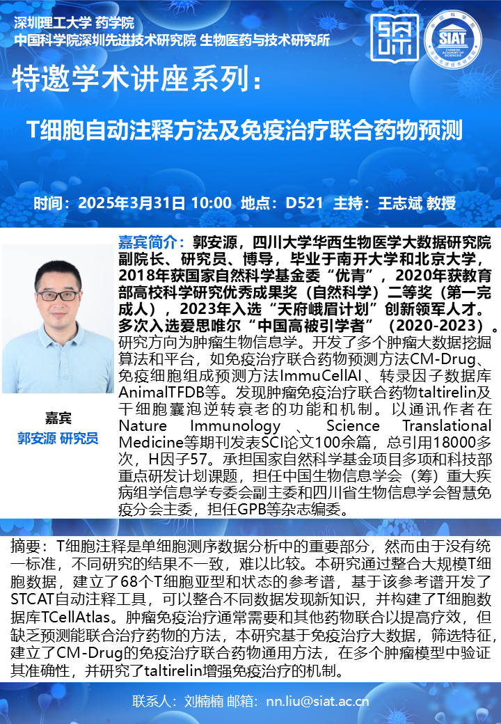 大家好!药学院/医药所“特邀学术讲座”系列将于2025年03月31日(周一)10:00,在先进院D521会议室举行。本次讲座邀请了来自四川大学华西生物医学数据研究院的郭安源 研究员带来题为“T细胞自动注释方法及免疫治疗联合药物预测”的报告。届时,王志斌 教授将主持讲座。