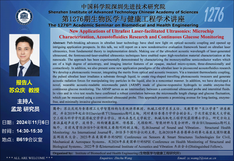 【2024年11月6日 医工所】New Applications of Ultrafast Laser-facilitated Ultrasonics: Microchip Characterization, Acoustofluidics Research and Continuous Glucose Monitoring