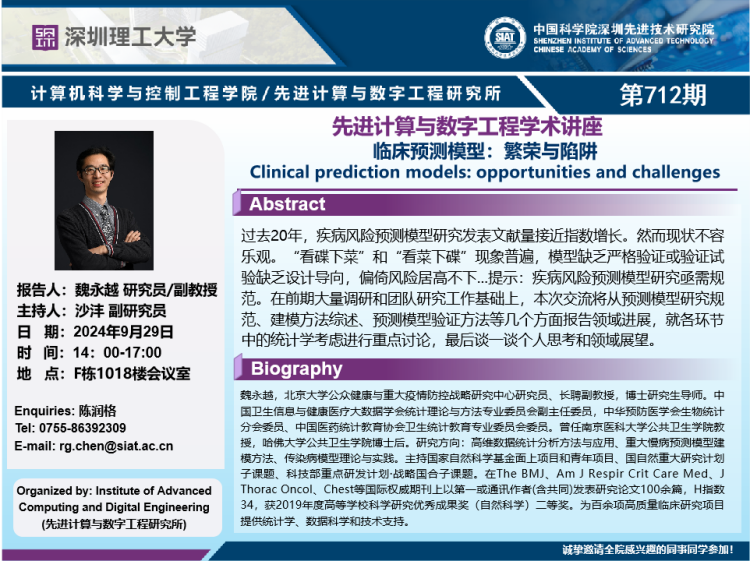 【2024年9月29日 数字所/计算机学院】临床预测模型:繁荣与陷阱(Clinical prediction models: opportunities and challenges)