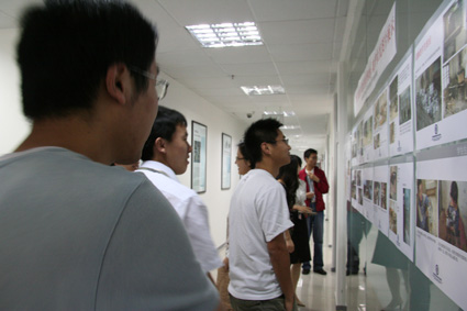 员工和学生们在贫困山区教育状况图片展前驻足观看