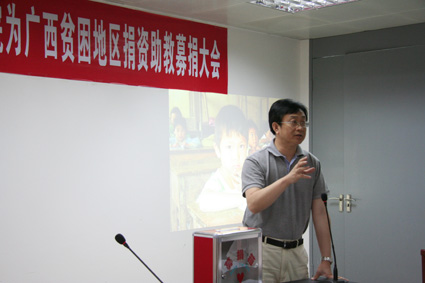 此次活动的捐助地实际情况,除了播放视频录像及举办图片展外,还由赴广西考察调研组成员张恒、李磊在会上做了介绍。他们也分别谈了自己的感受。即将走上社会的研究生张恒表示,今天我们“送人玫瑰,手有余香”, 加入到崇高的募捐行动中,一起播撒爱的雨露,携手走进温暖的春天。今后将更加努力学习,努力工作,多出成果,用实际行动回报社会!已经走上工作岗位的李磊博士结合我们最熟悉的科研项目启动基金例子,谈到了捐资助教募捐同样是贫困地区孩子们的人生启动基金,将为他们的成长及他们对社会的返哺提供帮助。