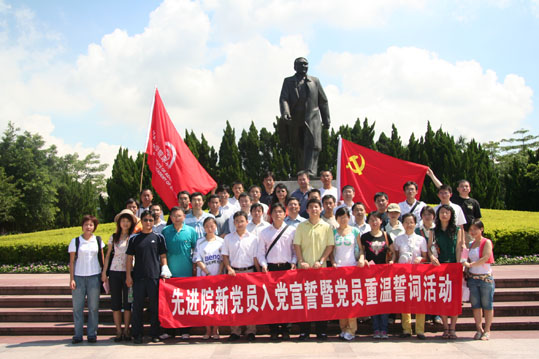 党员在党旗下郑重宣誓 在伟岸的邓小平像前,党员们面对鲜红的党旗,郑重地举起右手,表情庄严肃穆,在总支委员左成刚同志的领读下,大声宣读入党誓词,雄浑的声音回荡在整个莲花山顶上空。新党员王冬同志在会上激动的说:“经过重重考验,终于加入了党组织,今天在这里宣誓后,我要更加严格地要求自己,努力工作,当好先锋。”有着14年党龄,从海外回国的医工所王磊博士感慨万千:“今天我们以这种形式纪念党的生日,我觉得很有教育意义。看到许多年轻党员为建设国家而努力奋斗,我觉得很欣慰,同时我们这些老党员也更应该保持先进性,继续为党旗增光添彩。”王丽同志作为转正党员的代表发言,她表示,将牢记在党旗下的誓言,在今后的工作中努力做好本职工作,做一名合格党员。