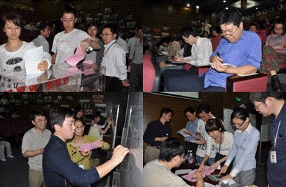 在大会主持左成刚同志宣读了深圳市直属机关工委对两委候选人建议人选的批复后,根据选举办法,进入两委委员候选人与全体党员交流的环节。15名两委委员候选人分别上台演讲,并接受党员的提问。通过交流后,全体党员进行了投票选举。大会根据党章的有关规定,采取无记名投票方式和差额选举的办法,选举产生了左成刚、白建原、吕建成、宋章军、郑海荣、胡庆茂、徐明亮、樊建平等9人(以姓氏笔画为序)为第一届党委委员;选举吕建成、毕亚雷、李慧云等3人(以姓氏笔画为序)为第一届纪委委员。计票期间,大会主持左成刚同志宣读文件,全体党员共同学习了近期中共中央印发的《中国共产党党员领导干部廉洁从政若干准则》。