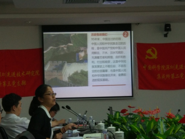 接下来,孙蓉同志在分享了学习习近平总书记在中国共产党成立95周年上的讲话及参加院党委中心组学习的体会,与大家一起回顾党在历史上的三大贡献、八个不忘初心,并引用习近平总书记“60多年的实践证明,我们党在这场历史性考试中取得了优异成绩,同时,这场考试还没有结束,还在继续……”呼吁同志们要有信心,不断努力!同志们颇受鼓舞。她还结合实际工作,在会上分享了李光林所长推荐的习近平总书记要求建设“三型”一体的国家实验室的讲话,强调科技是强国的重要保障,呼吁同志们坚守岗位,做好本职工作,努力做到“创先争优在岗位”。