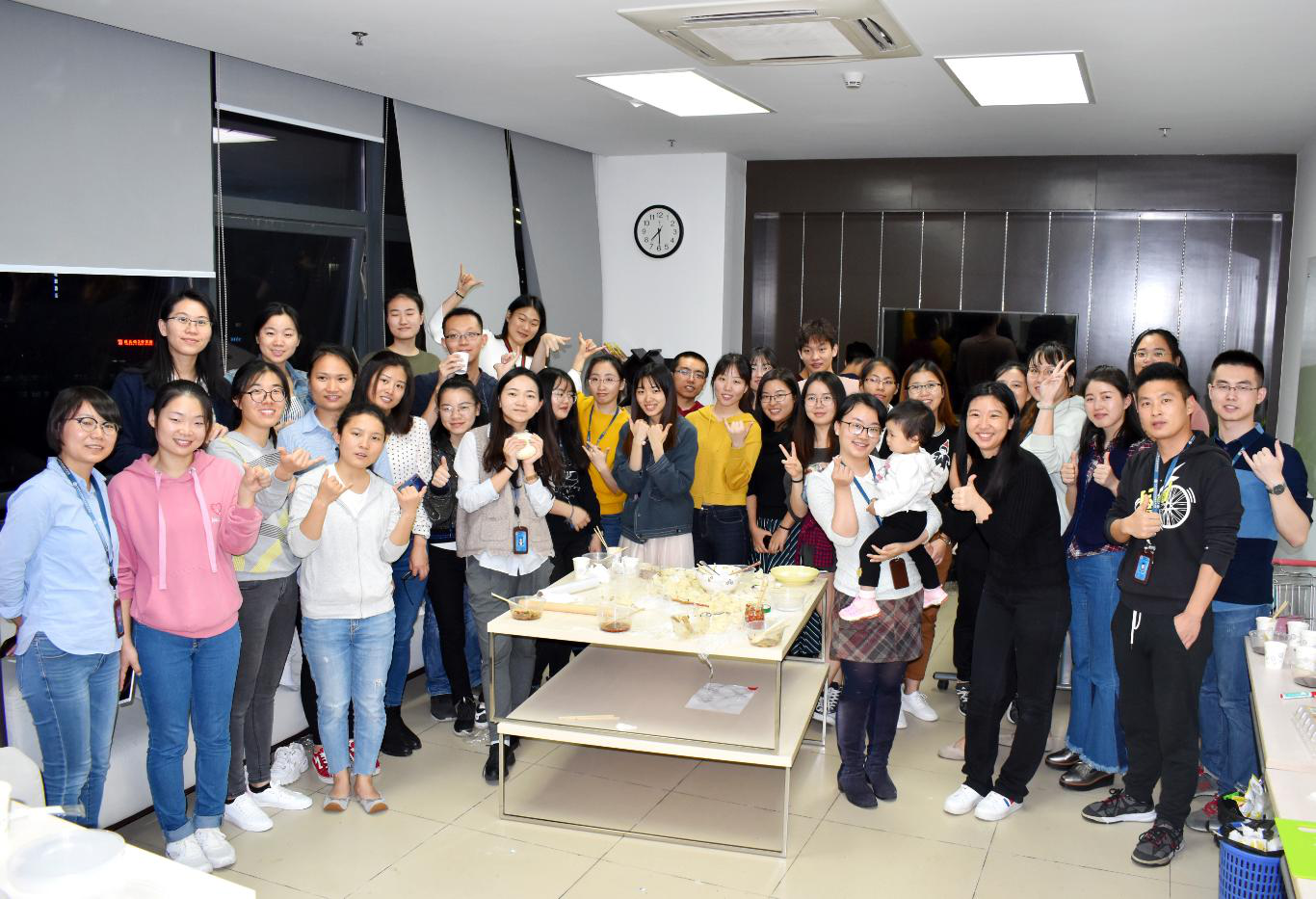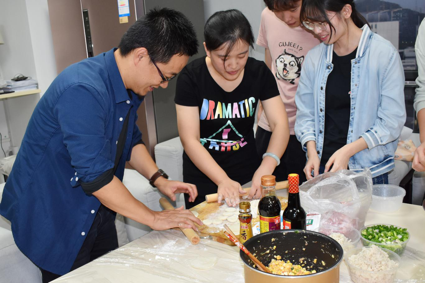 下班后,大家就集聚在12楼休息间,各自发挥所长,自觉取用桌子上已经摆好的食材。大家不光实验做的好,下厨房也身怀绝技,十八般武艺齐上阵,和面、剁馅拌馅、擀皮、包饺子,大家分工配合,有人拿着音响为活动助兴,还有人热心的为辛苦做饭和来休息的同伴做好服务工作。