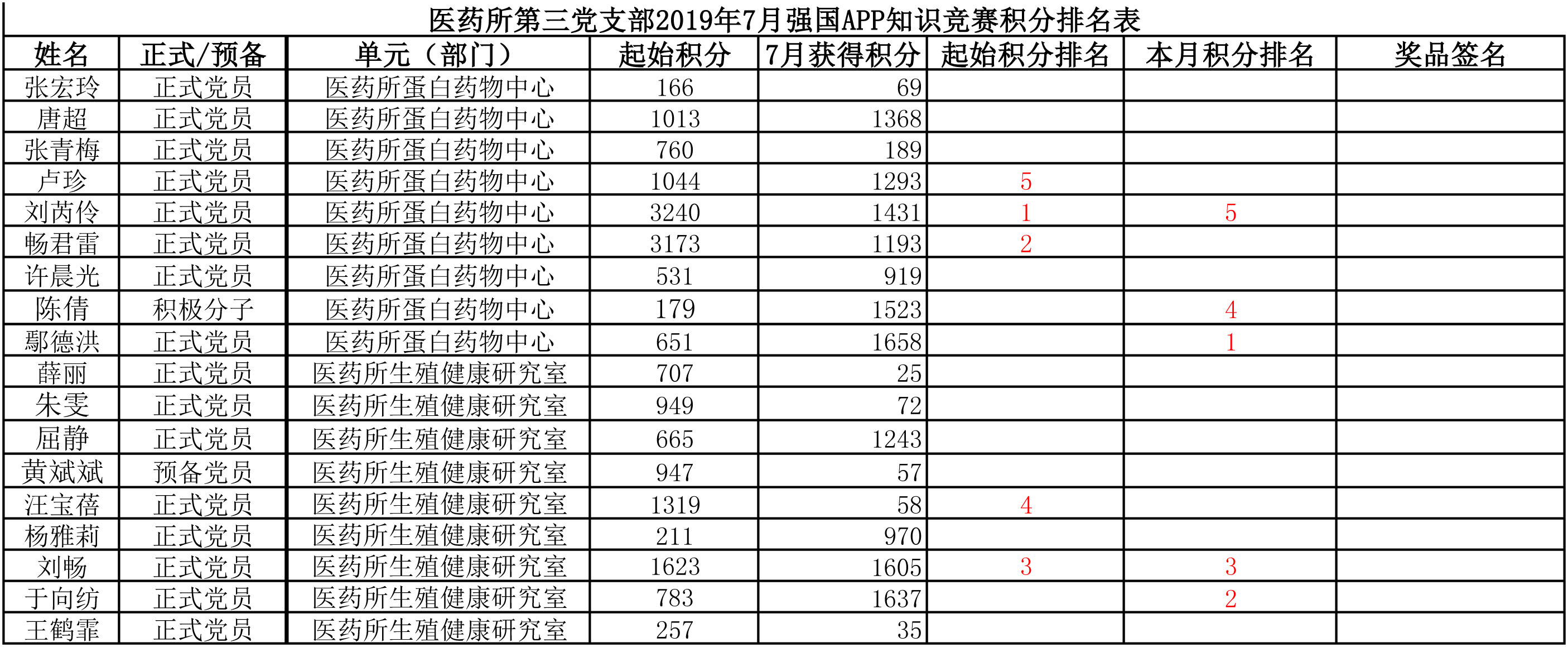 医药所第三党支部2019年7月强国APP竞赛积分排名表