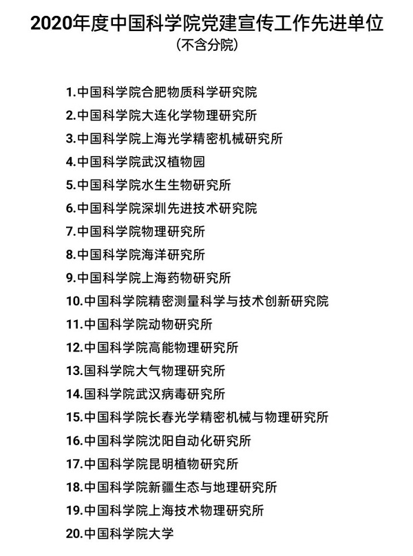 12月17日,中国科学院通报了2020年度党建宣传统计综合得分情况,并对排名前20的单位(不含分院)进行了表彰。中国科学院深圳先进技术研究院以中科院第6名、广州分院第1名的成绩获得了“2020年度中国科学院党建宣传工作先进单位”称号。