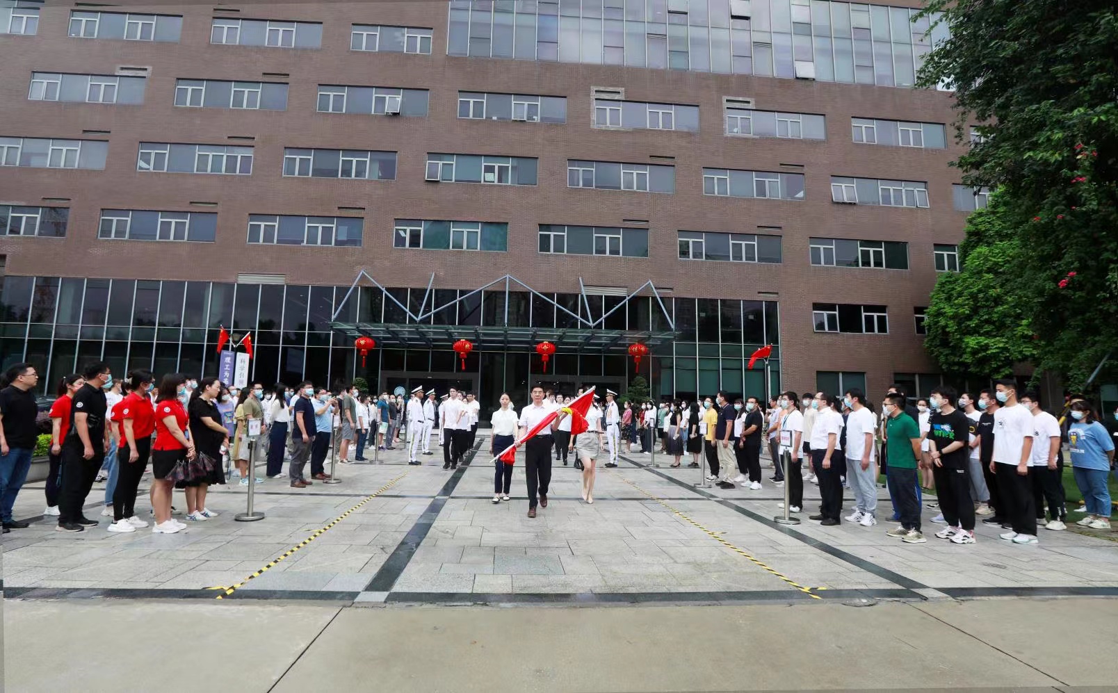 今年国旗护卫队由学生组成,他们踏着整齐铿锵的步伐,庄严地将鲜艳的五星红旗护送进场,展现了SIAT学生们团结进取、积极向上的精神风貌。护旗手由优秀员工代表及学生代表担任,分别是计算机学院唐金陵教授,优青代表戴卓君博士以及中国科学院院长特别奖获得者蔡思琦同学。