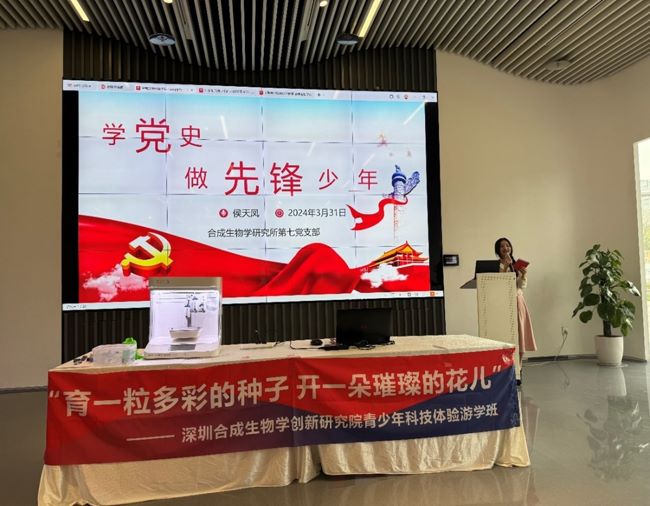 为将红色基因厚植童心,激发科技探索热情,3月31日,光明科学城合成生物学科技产业链党委、深圳合成生物学创新研究院党总支、合成生物学研究所第七党支部、深圳合成生物学创新研究院巾帼文明岗工作小组、深圳合成生物学创新研究院分团委、中山大学附属小学联合开展了“育一粒多彩的种子 · 开一朵璀璨的花儿”青少年科技体验游学活动。光明区科技创新局代表洪剑虹出席并主持活动,各单位相关负责人及近40位同学参加活动。