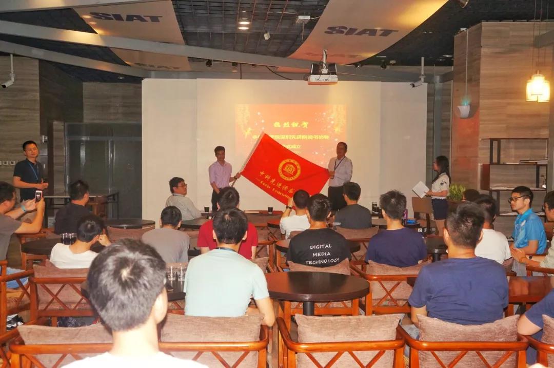 先进院、副院长 工会主席许建国(右)向读书协会会长李唯正授予会旗