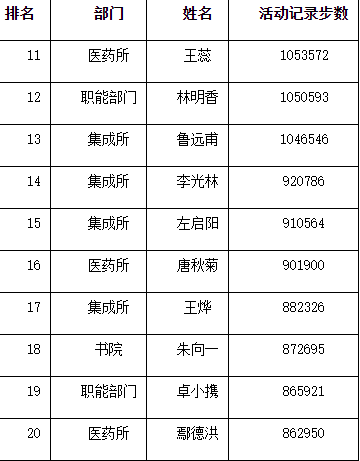 健步总里程中,健步总步数在SIAT总排行榜前10名的,颁发健步总里程奖金奖奖牌一枚,奖励科苑群团云工会300元提货券;健步总步数在SIAT总排行榜第11-20名的,颁发健步总里程奖银奖奖牌一枚,奖励科苑群团云工会200元提货券;健步总步数在SIAT总排行榜第21-30名,颁发健步总里程奖铜奖奖牌一枚,奖励科苑群团云工会100元提货券;具体名单如下: