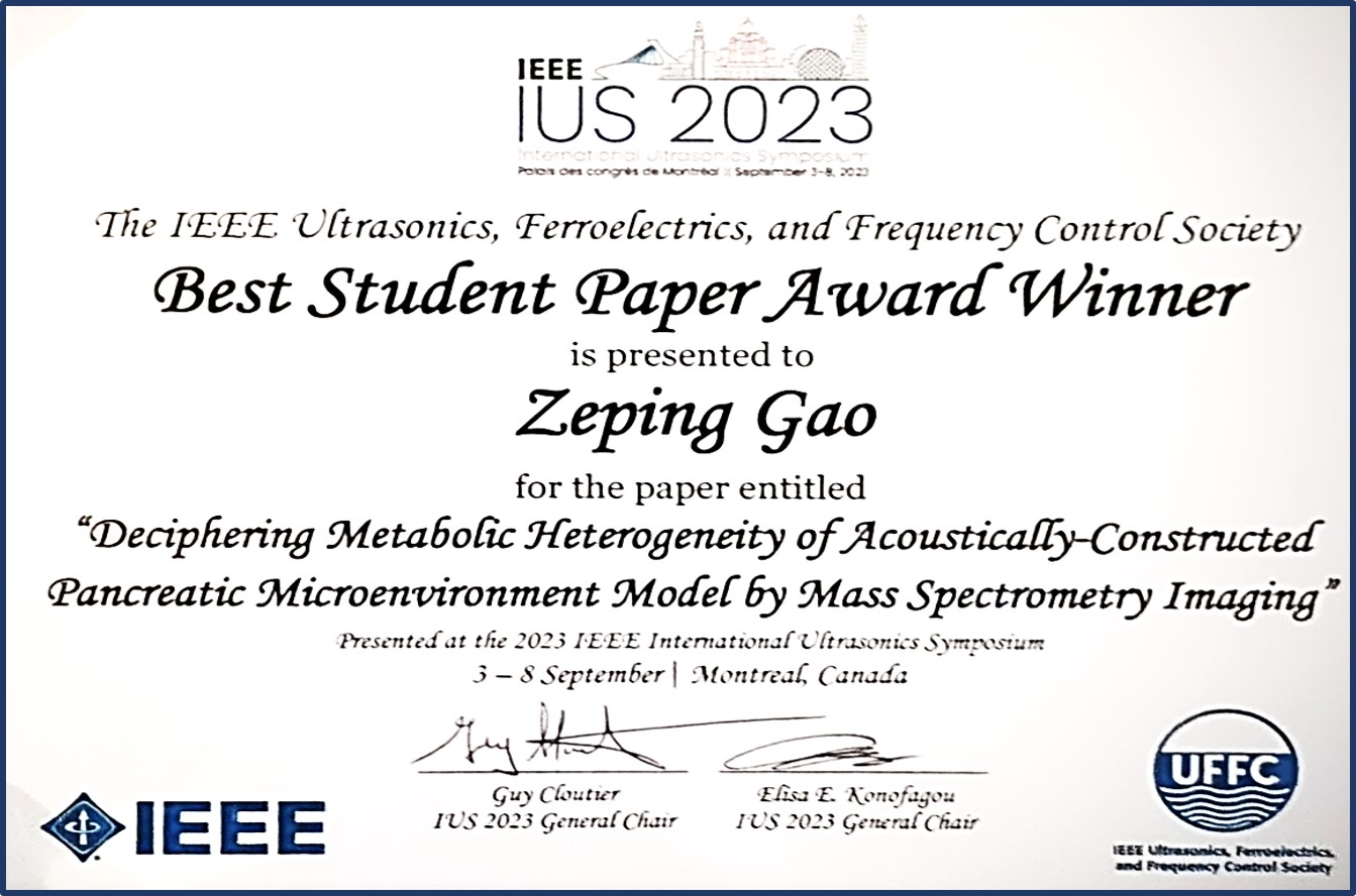 获奖论文以Deciphering Metabolic Heterogeneity of Acoustically-Constructed Pancreatic Cancer Microenvironment Model by Mass Spectrometry Imaging(胰腺癌微环境模型的全息声学构建与代谢异质性解读)为题,由深圳先进超声团队以及质谱成像团队共同完成,深圳先进院国科大硕士生高泽平为论文和本研究的主要作者以及汇报人。