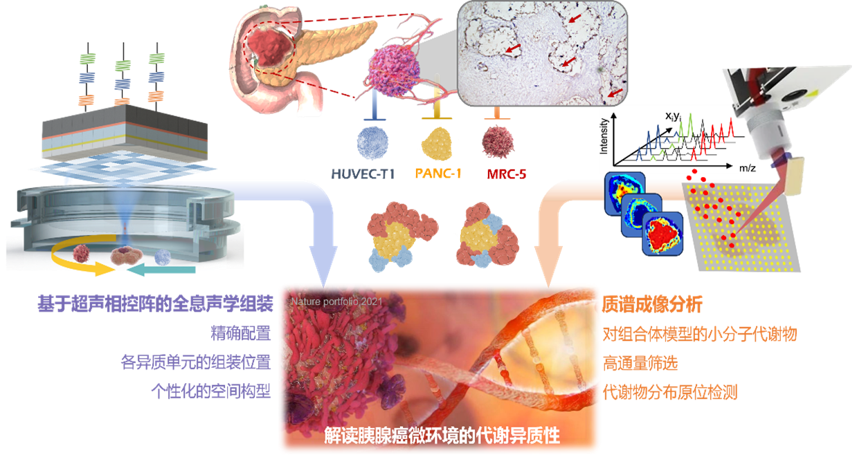 该研究首次将全息声镊科研仪器与组织工程中复杂模型构建的需求相结合,以超声相控阵对全息声场的动态构建为基础,设计开发了一系列声学组装策略,实现了对细胞球、类器官的精准选择、位置移动、旋转对准、装配、夹紧等操作,并构建出了具有能够模拟肿瘤及其微环境的装配体模型。此外,研究结合质谱成像技术进一步构建出装配体的代谢全谱图,为肿瘤代谢异质性研究提供了精准的物质分子定性、定量和空间定位信息,同时为探索组织功能发展机制、疾病的发展过程提供新的视角与手段。