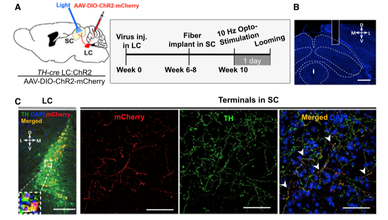 在此项研究中,李蕾、冯晓龙、周政等综合利用神经环路示踪、光遗传学、药物遗传学等技术方法发现:在压力应激下,位于脑干的蓝斑核团(locus coeruleus,LC)被激活;光遗传学技术特异性调控LC中的去甲肾上腺能神经元,能诱发出动物的焦虑样行为,当恐惧信号袭来时,动物表现出更加显著的逃跑反应。团队又进一步验证发现,这一类神经元投射到了上丘(superior colliculus,SC),并通过SC核团的去甲肾上腺能受体对视觉恐惧信号处理过程进行调控,加剧了动物的逃跑反应。