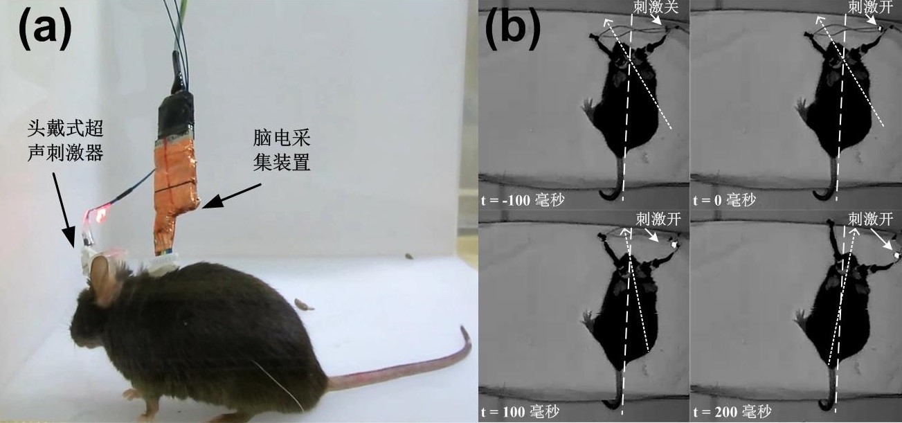 图1. (a)安装了头戴式超声刺激器和脑电采集装置的清醒小鼠;(b)超声调控小鼠转头行为的实验视频截图