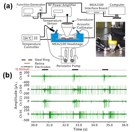 图2.(a)超声视网膜刺激实验装置;(b)微电极阵列记录的不同节细胞超声反应