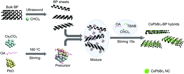 钙钛矿纳米晶颗粒在二维黑磷表面的原位生长示意图