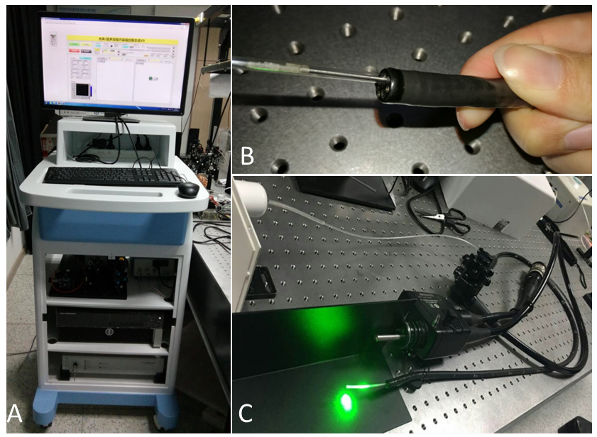 图1 A:光声消化道内窥系统实物图;B:内窥导管(外径2.5毫米)完全兼容现有临床消化内镜,可经其活检通道进入人体消化道;C:内窥导管(长2米)可在临床消化内镜手术下进行光声/超声双模成像实验。