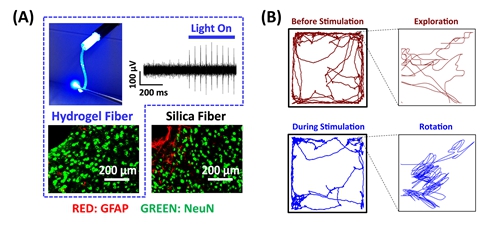 为了解决上述问题,研究团队合成了具有高导光性的海藻酸钠-聚丙烯酰胺水凝胶材料,并且在此基础上制备出了直径为100-600微米的水凝胶光纤。制备的水凝胶光纤具有优异的光学和力学性能,在空气中测得的光传导损失率仅为0.25dB/cm,杨氏模量与神经组织接近(约60kPa),并且能反复拉伸至初始长度的400%以上。借助这种水凝胶光纤,可以稳定地诱发出神经元的特异性相应,并实现对动物行为的控制。此外,与传统的石英光纤相比,这种水凝胶光纤具有更佳的组织相容性。并且在经过长期的体内埋植后,水凝胶光纤仍能基本保持原有的光学和力学性能。得益于上述特性,团队研发的水凝胶光纤将为光遗传技术在脊髓和周边神经的应用乃至未来的临床化发展提供重要的技术支持。