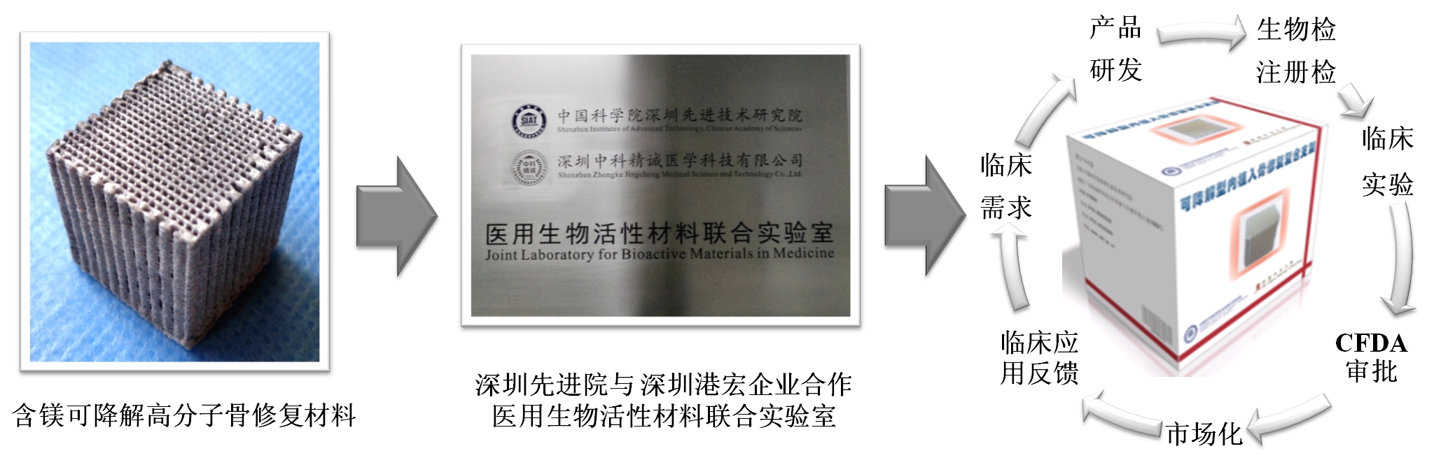 CFDA施行的《创新医疗器械特别审批程序》对于企业所申请产品的获批条件十分严格,重点强调产品主要工作原理/作用机理为国内首创,产品性能或者安全性与同类产品比较有根本性改进,技术上处于国际领先水平,并且具有显著的临床应用价值。含镁可降解高分子骨修复材料产品是深圳先进院转化中心团队历经8年潜心钻研,利用先进的低温3D打印技术,创新地将具有促成骨和成血管活性的金属镁,均匀复合入PLGA/TCP(乙交酯-丙交酯共聚物/磷酸三钙)可降解多孔支架中,通过3D打印赋予此产品理想的促成骨仿生结构,孔隙之间具有很高的连通率,这种结构特征在组织学具有理想的骨传导作用,可提高骨细胞粘附,增殖和迁移,促进骨组织的生长。