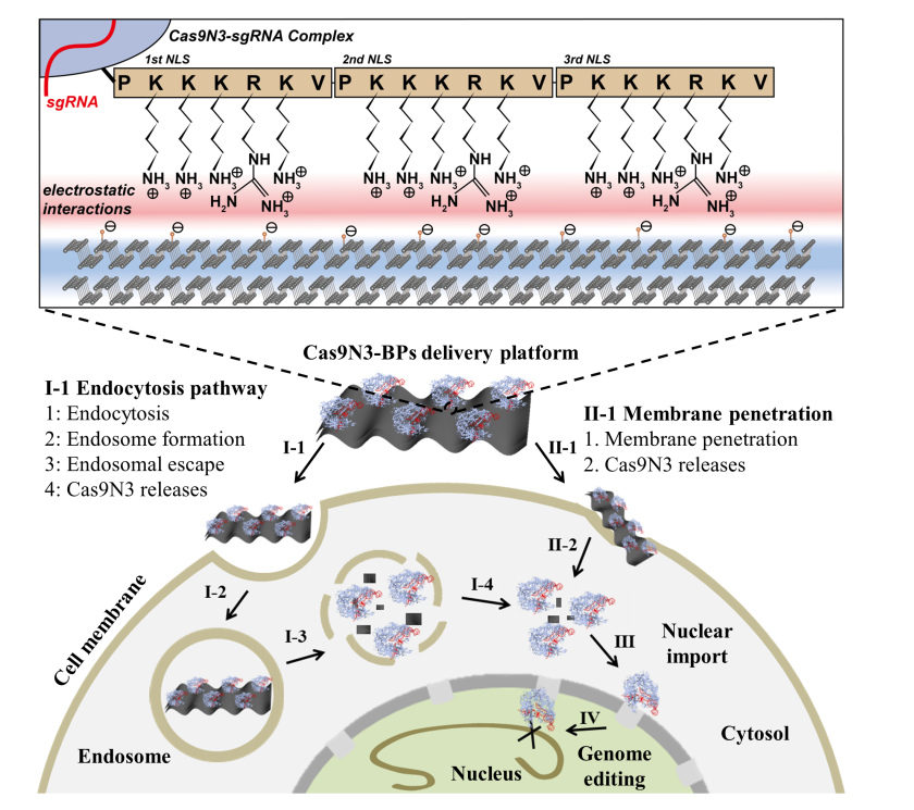 图1: 基于黑磷纳米片的Cas9-sgRNA复合体转运体系细胞内作用示意图。
