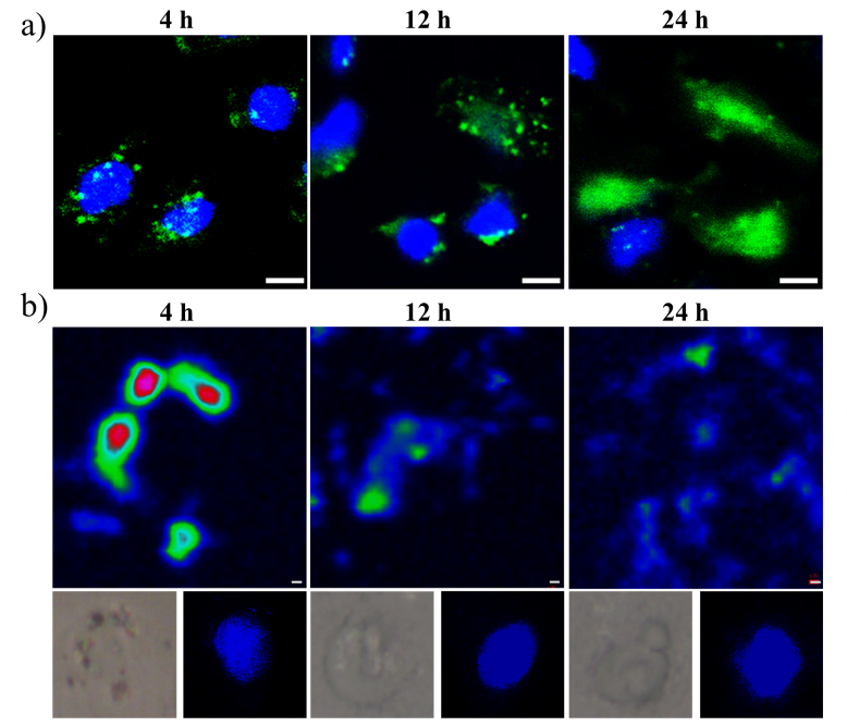 图2: 基于黑磷纳米片的Cas9-sgRNA复合体转运体系的(a)胞质输运以及核转运;和(b)黑磷纳米片在细胞内的降解过程。